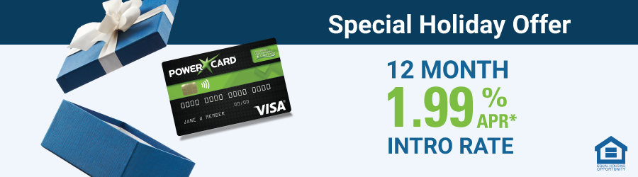 *APR=Annual Percentage Rate. Introductory rate of 1.99% APR applies to any advances added to your UECU Visa® Power Card™ during the first 12 months after its issue. At the time of your card application, your regular variable interest rate is based on an evaluation of credit-worthiness criteria and is identified in your credit card agreement and disclosures. Not all applicants will qualify for approval. Following 12 complete monthly UECU credit card statement cycles, all balances, existing and new, will accrue interest at your regular variable rate, which is the Wall Street Journal Prime Rate (“index”) plus or minus the “margin” as disclosed in your credit agreement and disclosure. APR will not exceed 18%. The intro rate offer of 1.99% APR is for first time cardholders only. Offer may be withdrawn at any time without notice.